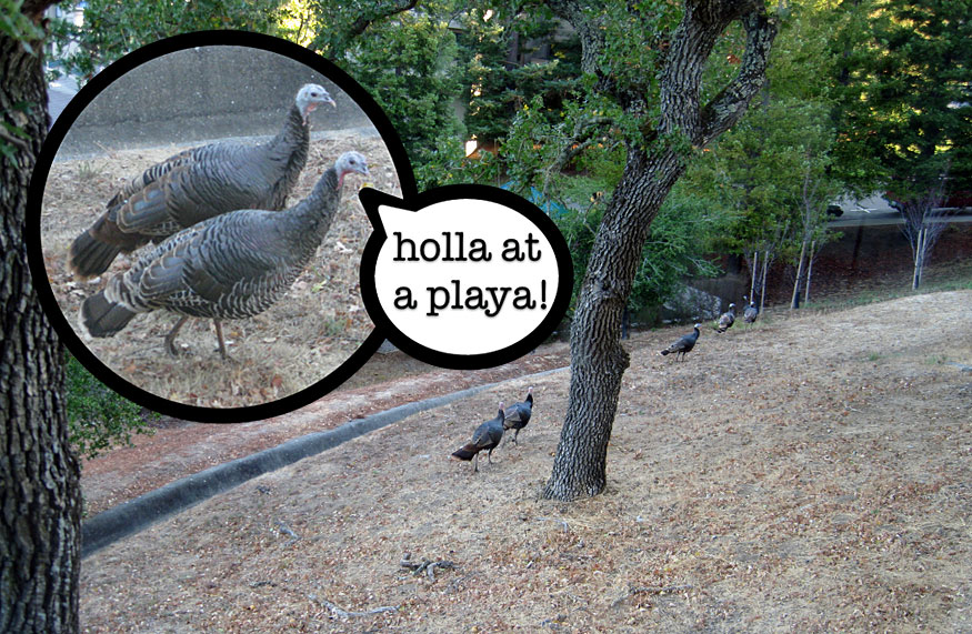 You know you’ve moved out to the cut when you look out your living room window and see a gang of wild turkeys guarding the hillside.