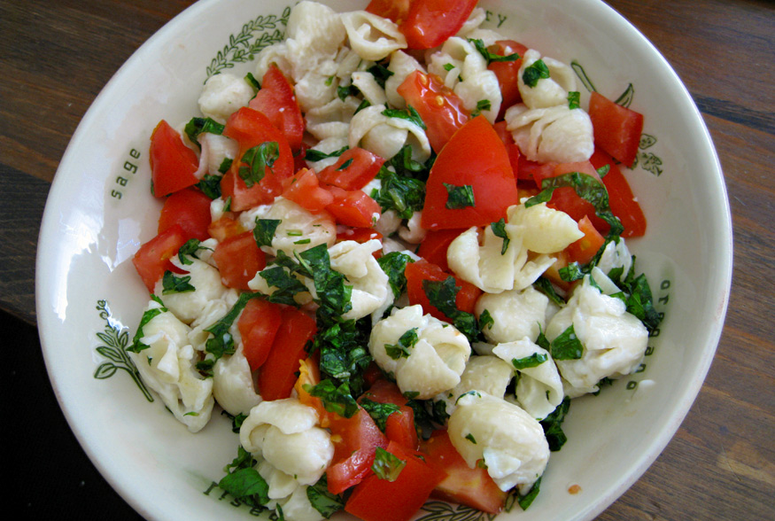 Cook one box of Pasta Roni Shells & White Cheddar per directions (to cut down calories and fat, leave out the butter and use skim milk). Stir in one chopped tomato and a handful of chopped basil leaves. Season with salt and pepper.