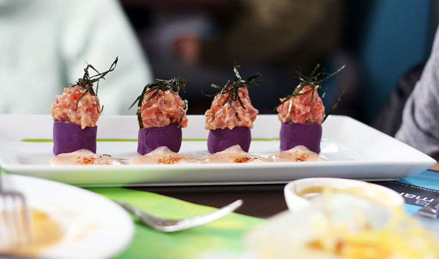 The Causa Nikei dish (purple potato, Ahi tuna, Nikei sauce, avocado puree, creamy aji amarillo and rocoto Huancaina sauce) from La Mar restaurant in San Francisco.