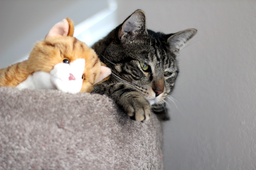 Détente November 24th, 2012 by Karen 15 Comments Breaking news: Tabs and Marmalade seen chilling on top of the cat tower in my living room!