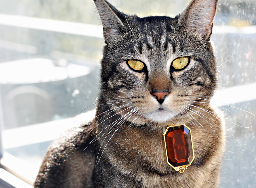 Kitty Couture March 24th, 2009 by Karen 9 Comments I suspect Tabs keeps losing his nylon collars on purpose. He prefers to be blinged out in Dior.
