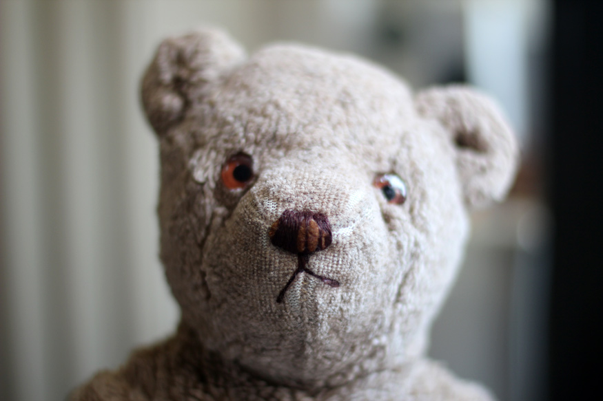Aww, he is very loved. I had a toy dog called Lucy The eyes, ears and nose were made of felt and my Dad was very good at sewing them back on when they fell off, but eventually they were too small to re-attach and she’s now deaf, blind in one eye and can’t bark – she consists of a head, a body and an eye. The best childhood toys are the most battered!