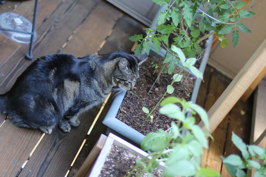Tabs loves his deck garden so much. It’s really coming along now. The tomatoes have already started to sprout tiny little green tomatoes, the cat grass has grown tall, and the catnip growing inside the Tabby Command Center is also doing well.