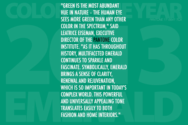 I’m way more excited about this than the tangerine shade chosen for 2012 – emerald green is GORGEOUS. Good choice! Can’t wait to see the stuff that comes out in honour of this pick in the next year.
