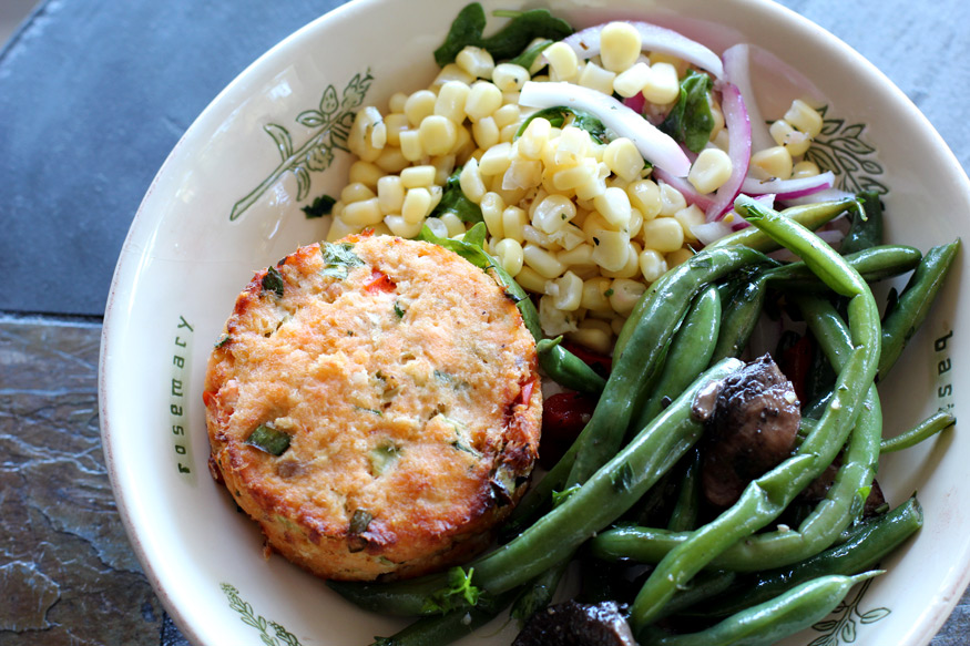 A Delicious Dinner July 25th, 2012 by Karen 5 Comments A salmon cake, corn and arugula salad, and green beans with portobello mushrooms. Om, nom nom!