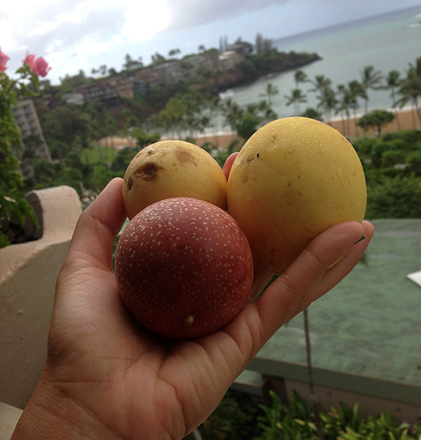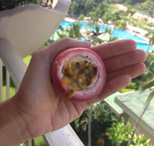 Those passion fruits (the yellow ones) are also known as lilikoi. If you find that to be too tart, try the lilikoi (passion fruit) chiffon pie from Hamura Saimin. Judging by your hotel, which I’m not too sure you want mention, really isn’t far from Hamura Saimin. It’s off of Rice St located on Kress St. Hamura’s has the best saimin and ono lilikoi chiffon pie.