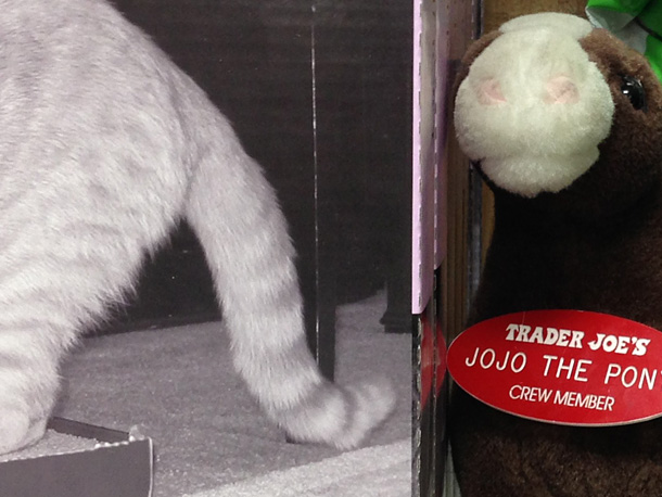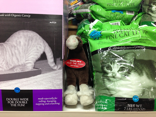 I found Jojo the Pony, a Trader Joe’s Crew Member, hiding on a top shelf. I guess he wasn’t in the mood to bag groceries.