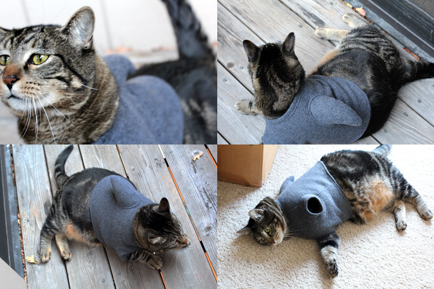Oh, man, that’s hilarious. Poor Tabs. I love the last picture where he got one paw out of the outfit. Adorable.