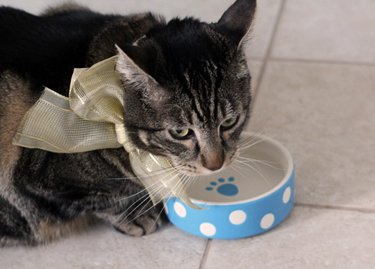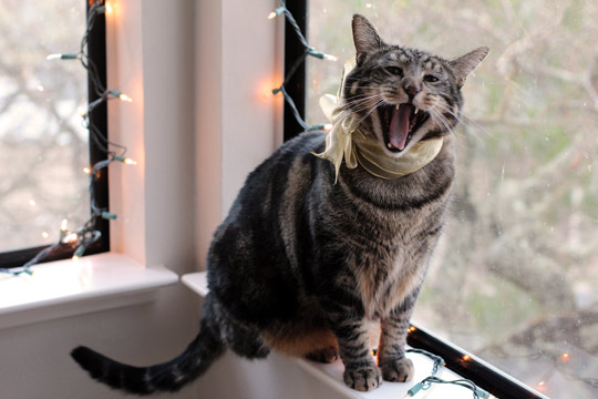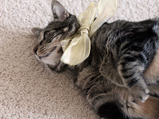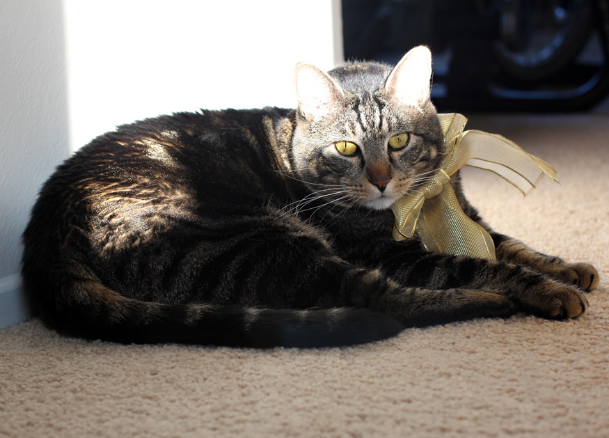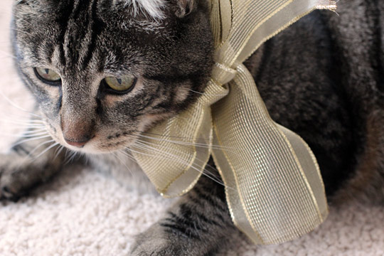 Tabs, your bow makes you look festive and sets your beautiful fur aglow! Now I have to buy bows for each of my 6 cats—they looked over my shoulder and saw your pic, jealous creatures!