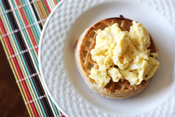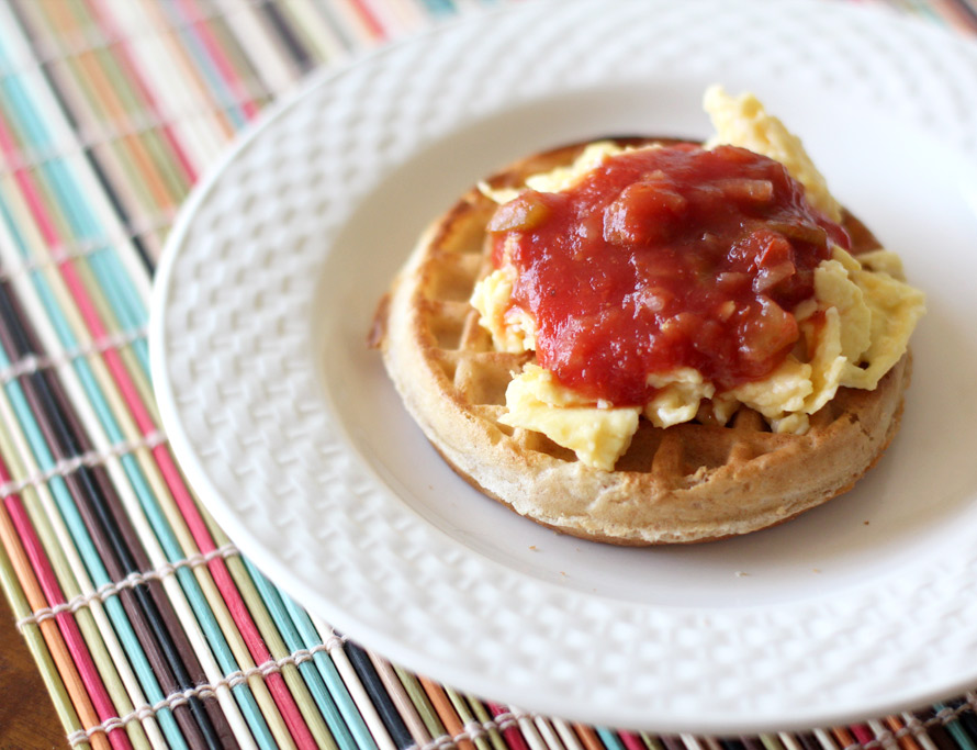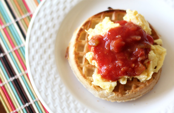 Scrambled eggs, salsa and, um, a frozen waffle? Yep, it sounded weird to me at first, but then I tried it, and now I’m 100% on board.