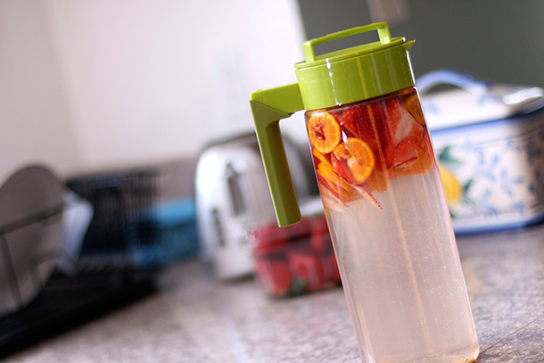 Anywho, in my latest attempt to curb my Vitamin Water Zero addiction/habit, I’ve been making improv fruit infused water at home.
