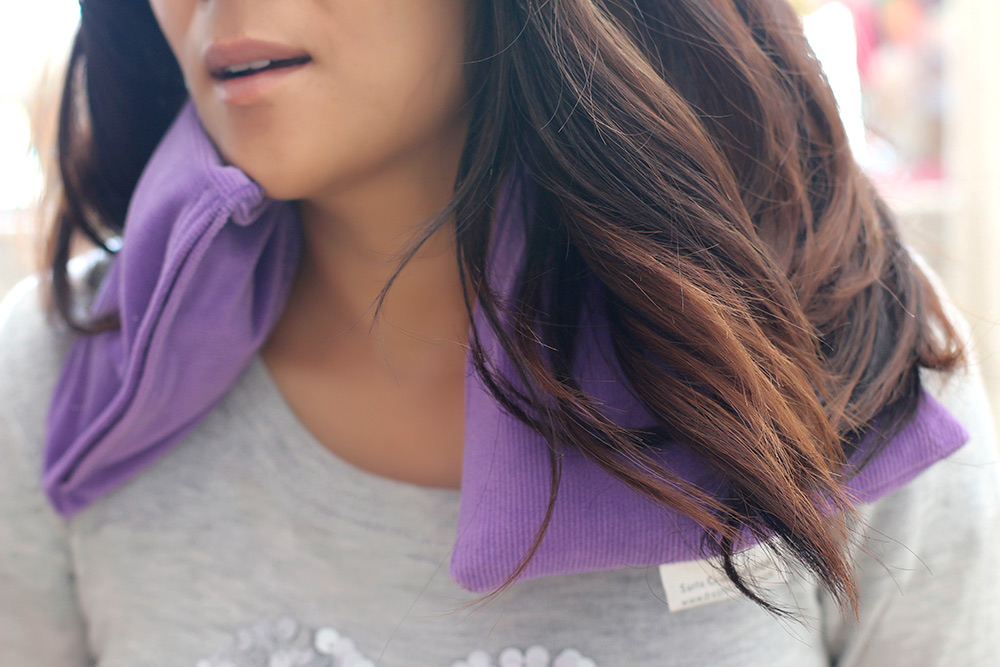 You can warm it up in the microwave or chill it in the freezer (if you use it cold, it’s supposed to reduce swelling and ease headaches), and the magic beads retain the heat or cold for about 20 minutes. You can use it on your neck, your shoulders, your back or wherever, and it REALLY helps.