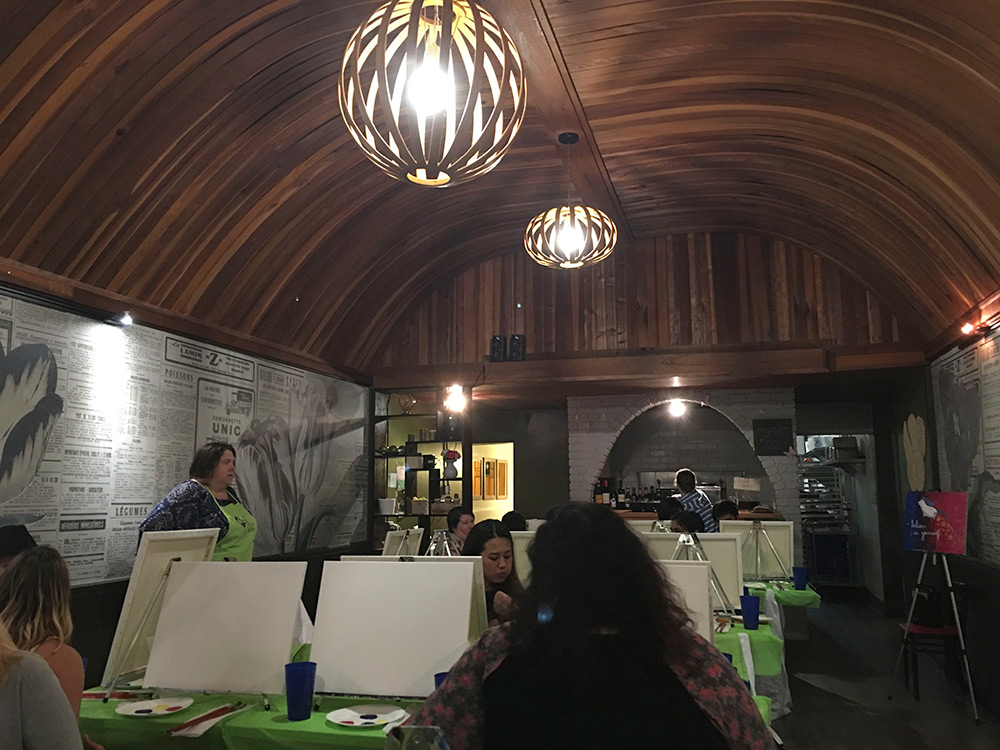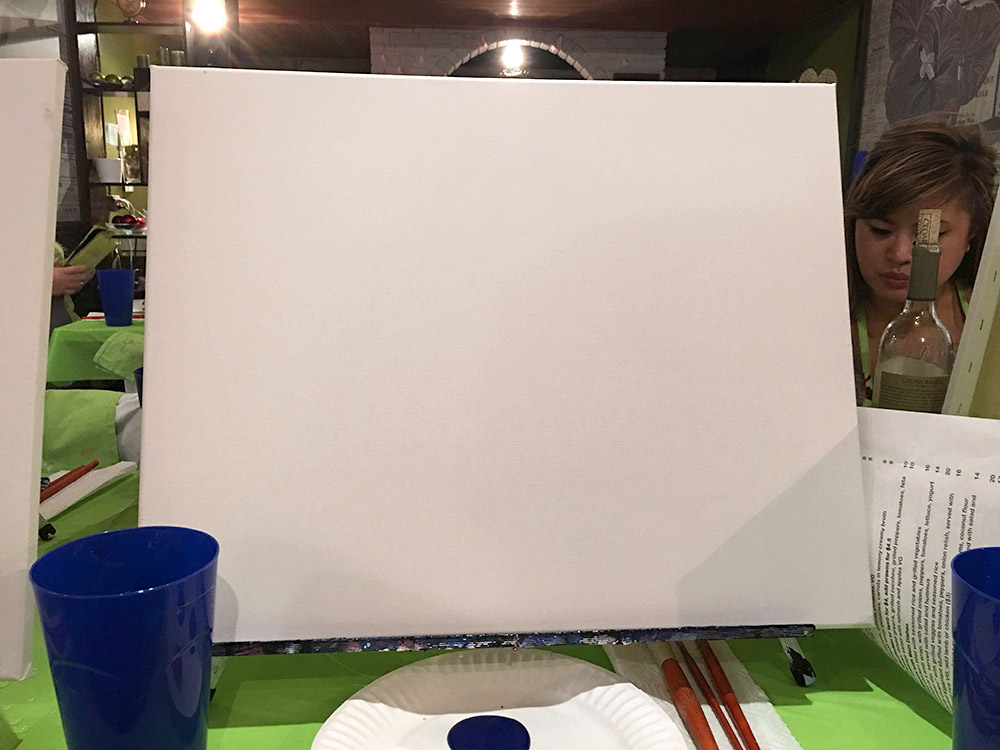 Basically, it’s a painting class with food and wine and a bunch of people in a restaurant. Everyone starts off with a blank canvas, so it’s not paint by numbers. You do use a pre-selected painting, though, which you pick when you sign up, as your template.