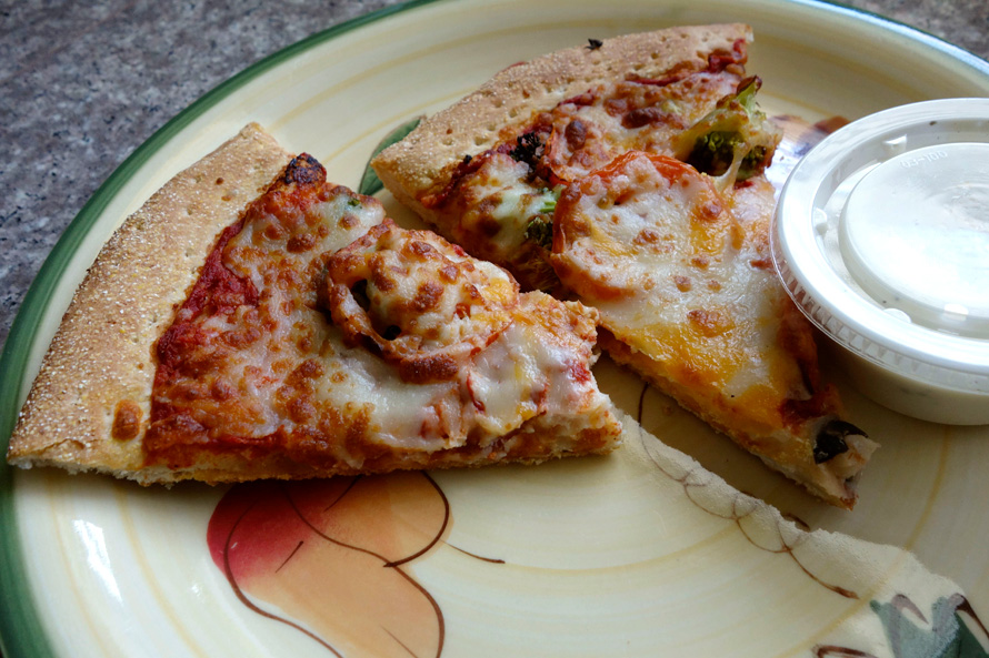 Day old pizza? Yes, but slightly warmed in the microwave. Making a note to try it with ranch dressing next time. Now I’m hungry. 🙂