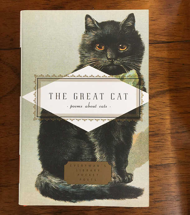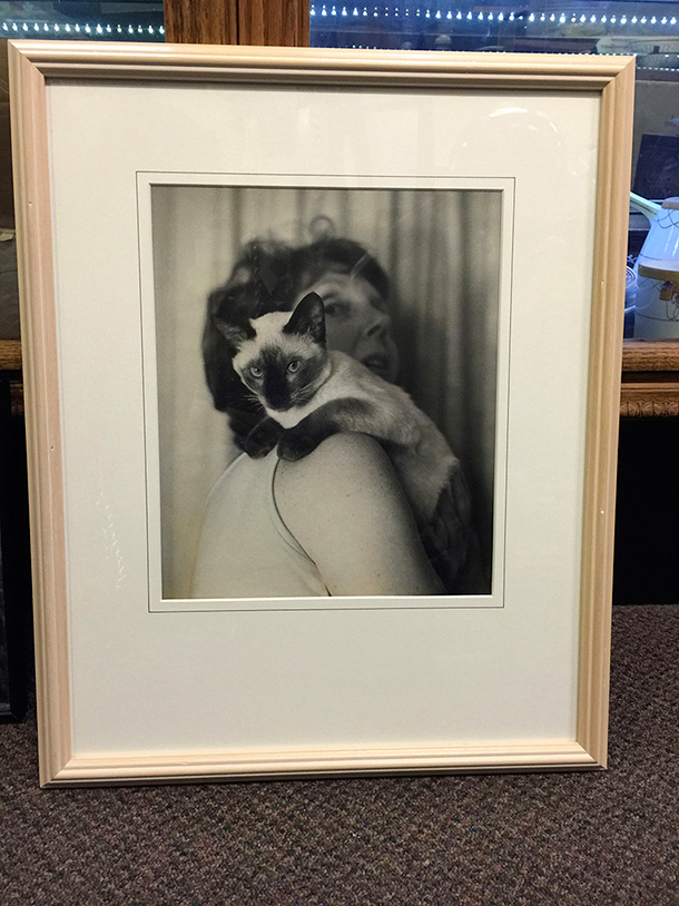 I kept running into cat-related things at different stores downtown, like that framed black and white pic of a lady with a cat on her shoulder (the pic at the top). I saw it in an antique store, and I dunno…it just moved me, maybe because Tabs does the exact same thing — drapes himself over my right shoulder.