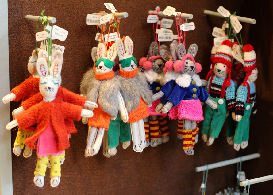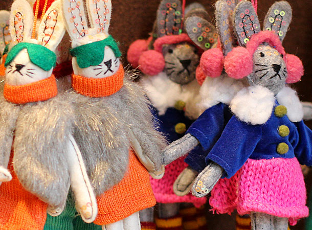 Bunny ornaments by Anthropologie. I love the sequins in their ears, the accessories (LEG WARMERS!) and how they all look a little grumpy.