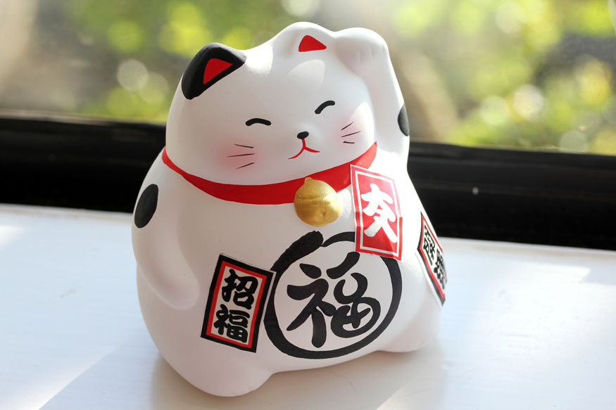 Maneki Neko can be found with either the right or left paw raised (and sometimes both). The significance of the right and left raised paw differs with time and place. The most common belief is that the left paw raised brings in customers, while a right paw brings good luck and wealth, although some believe the opposite. Still others say that a left paw raised is best for drinking establishments, the right paw for other stores. (Those who hold their liquor well are called hidari-kiki in Japan, “left-handed”). It is commonly believed the higher the raised paw, the greater the luck. Consequently, over the years Maneki Neko’s paw has tended to appear ever higher. Some use the paw height as a crude method of gauging the relative age of a figure. Another common belief is that the higher the paw, the greater the distance good fortune will come from.