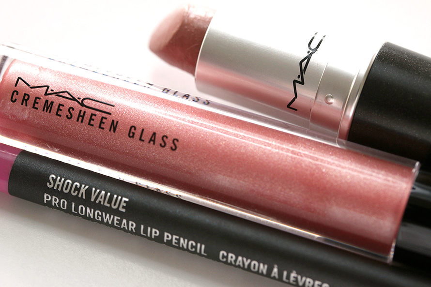 Here’s one to try if you like MAC: MAC Shock Value Pro Longwear Lip Pencil ($19.50) with MAC Modesty Lipstick ($16) and MAC Flare for Fantasy Cremesheen Glass ($20).