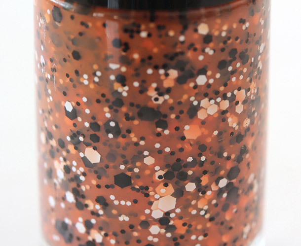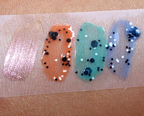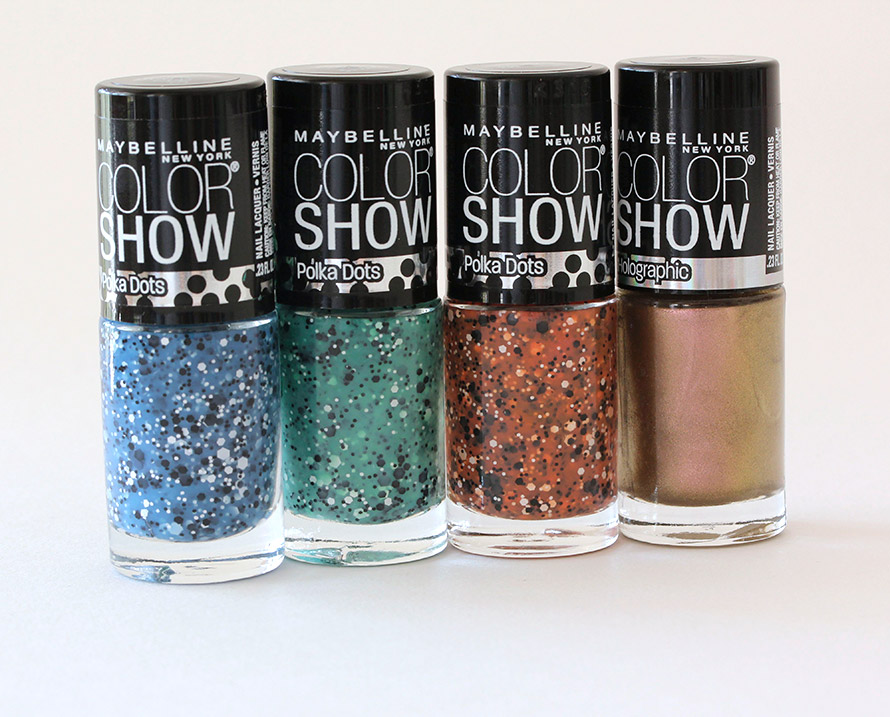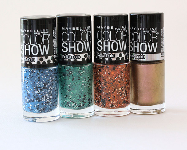 The three on the left are Color Show Polka Dots — available in five shades, each with black and white glitter in hexagonal shapes of different sizes that sort of look like dotted nails, and all have a sheer base that dries to a matte finish.