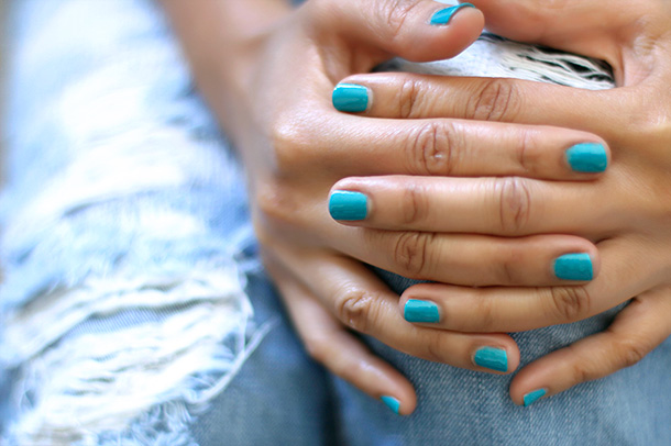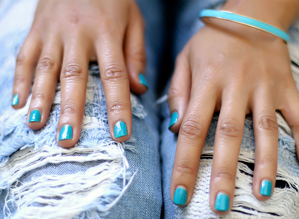 I love the contrast between the cute bright polish and roughed up denim.