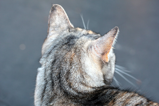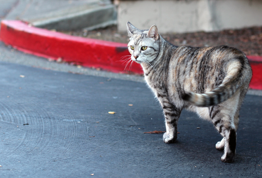 Aww hahaha. I photograph (and harass) neighborhood cats as well! There is this old lady that is super duper overly friendly. I have been tricked into thinking she was meowing and rubbing her head on my calf like mad because she wanted food, but when I brought her some food downstairs she wouldn’t even look at it. Guess she just needed a good hug! A neighbor from across the street once told me she wanders around looking for free hugs all the time. She has a collar but nobody knows (at least I haven’t found out) where she lives! Tango is always a bit suspicious after I play with her, but he doesn’t have as much territory thing as Tabs does (Tabs has been out there while Tango is 100% indoor. This has to be it)!