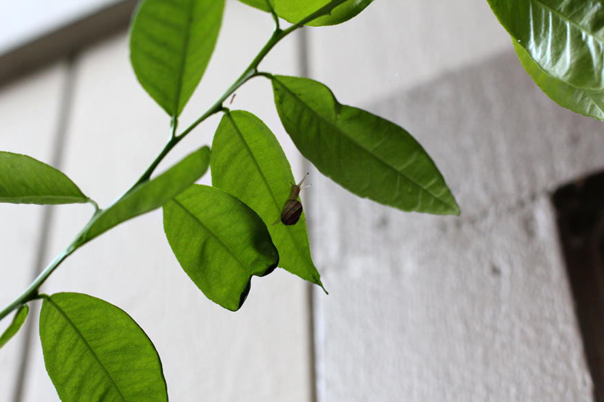 A tiny snail clinging to one of the leaves at the top of my orange tree. Why did she climb so high? Where was she headed? What did she plan to achieve by getting to the top of this tree? So many questions…