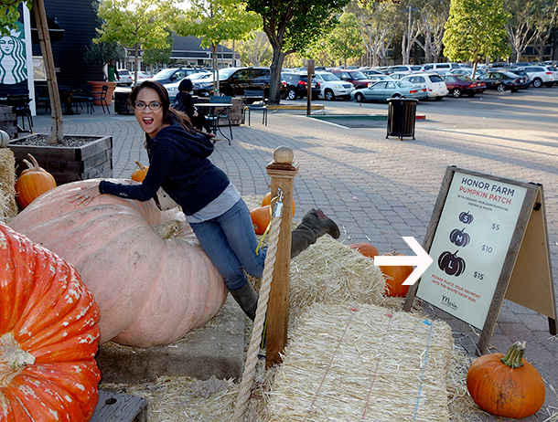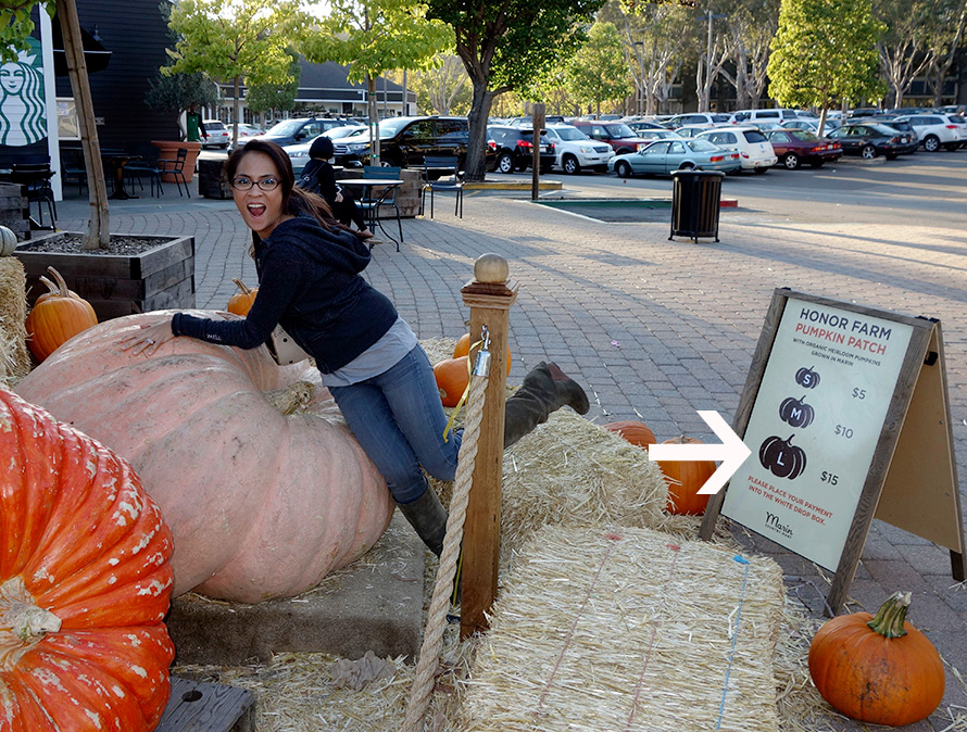 Right out in front of the shop, there’s this thing called an honor farm pumpkin patch. You just pick a pumpkin you want from the patch, and then voluntarily pay (well, that’s the idea) the suggested amount in the little lockbox.