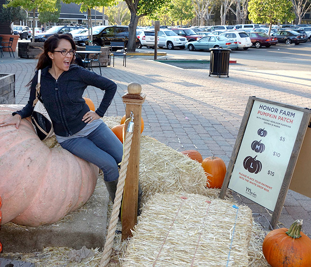 Of course, being the pumpkin fiend that I am, I wanted one of the gigantasaur, 300-pound pumpkins because — just imagine all of the pies you could bake with that! — but there was no way we were fitting one of those bad boys in the backseat of a Mazda.