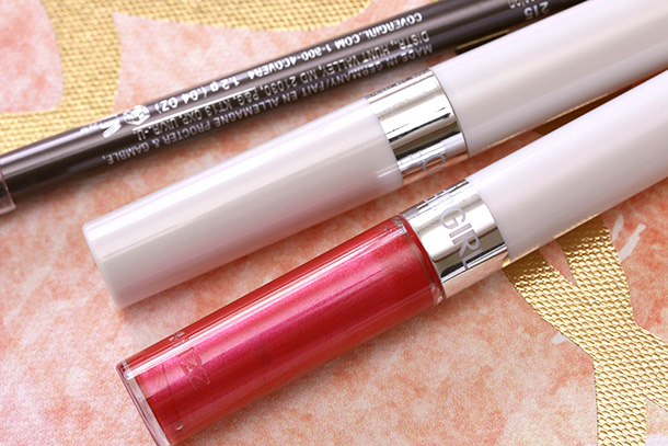 First, I line and fill in my lips with neutral red LipPerfection Lip Liner in Passion ($6.74). Next, I add a layer of metallic reddish berry Outlast All-Day Lip Color in Beaming Berry ($9.99) directly on top. Then, for extra shine, I top it all off with the clear topcoat that comes with Outlast All-Day.