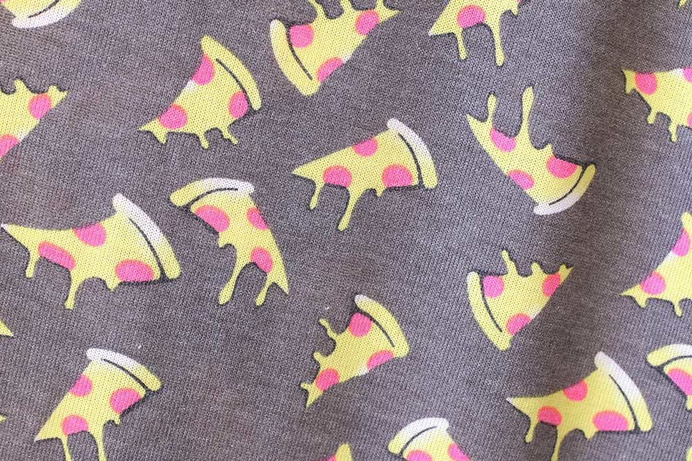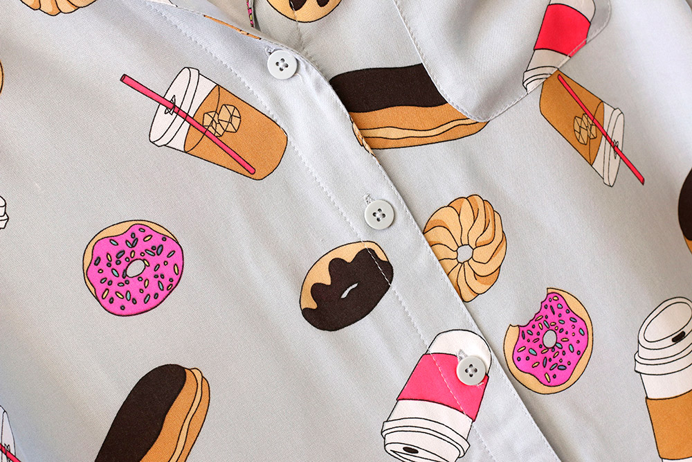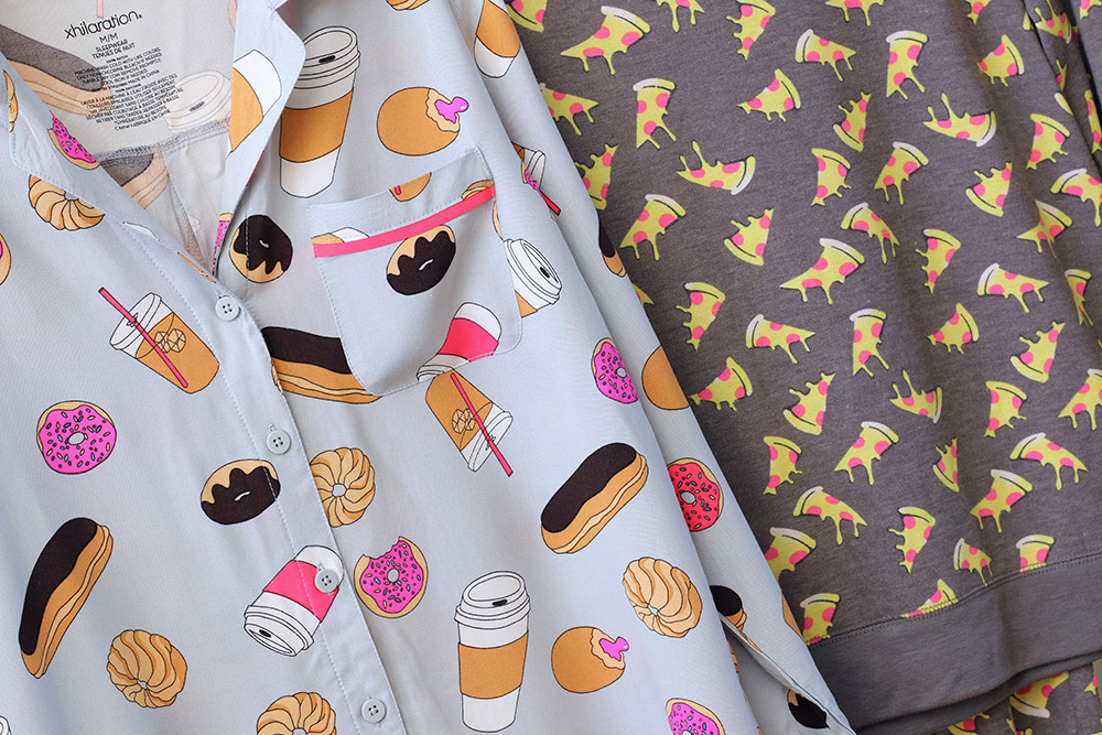 The button-down one with the doughnuts and coffee is a nightgown ($17.99), but the one with the melty slices of pepperoni pizza on it ($21.99) is a two-piece ensemble.