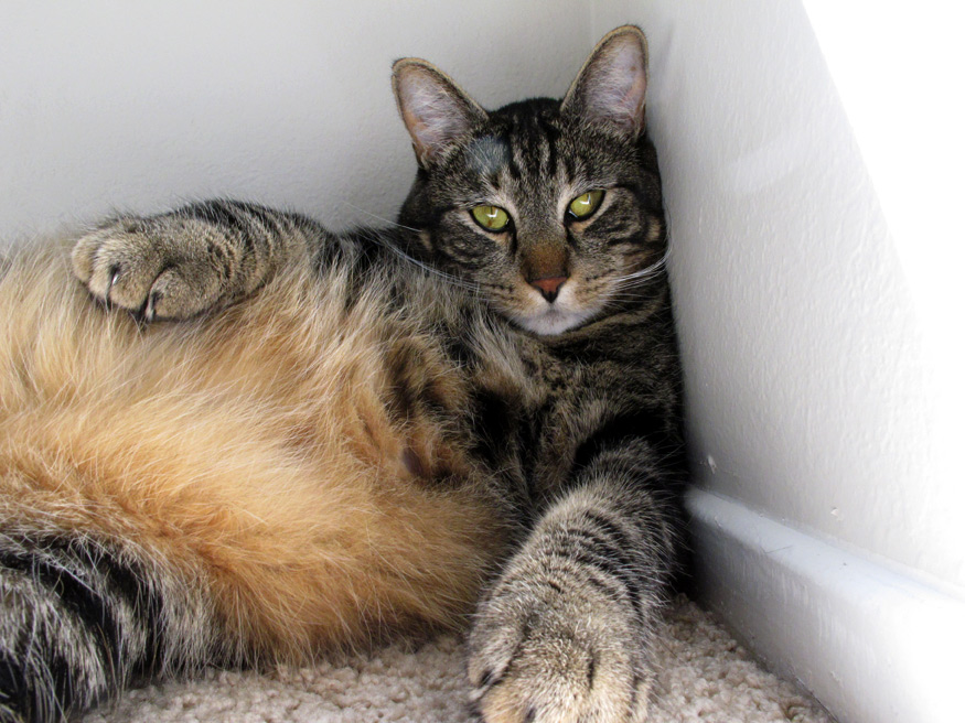 Tabs looks like he’s channeling ’70s-era Burt Reynolds here (type “burt reynolds cosmo centerfold” in Google to see what I mean, wink wink)… but hey, who needs a bearskin rug when you’re already an impressive ball of fur yourself? ROWR, indeed! 😉