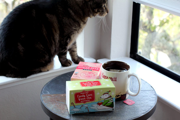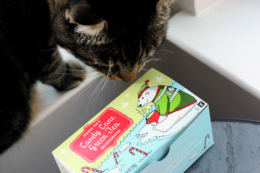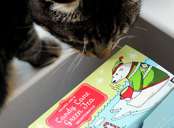 I picked up a couple of new teas at Trader Joe’s yesterday. Would you like Ginger Pear White Tea or Candy Cane Green Tea? Let Tabs know and he’ll brew you a cup.