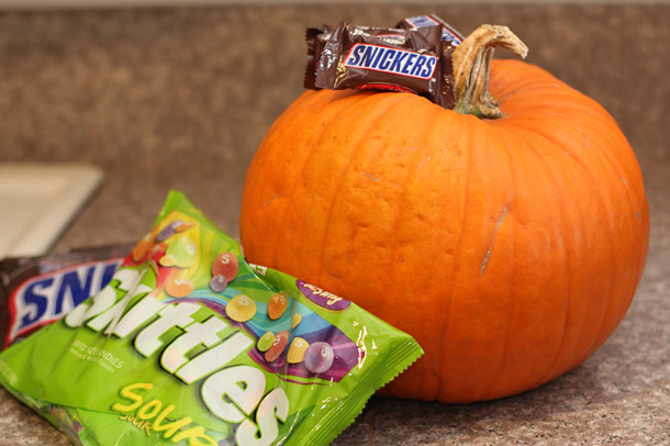 Trick or Treat October 31st, 2012 by Karen 21 Comments The neighborhood kids are getting Snickers and Sour Skittles this year. (Note to self: Do not eat all of the Snickers and Sour Skittles this year.) I’m also supposed to carve that pumpkin for Tabs… Happy Halloween!