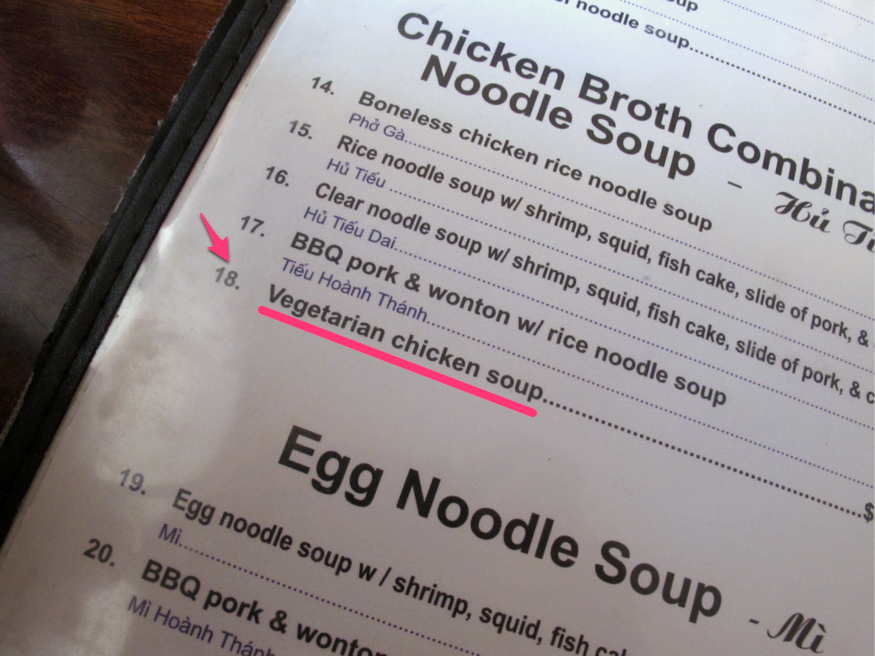 I went to a Vietnamese restaurant for pho (noodle soup) last weekend and saw this “vegetarian” item on the menu. They also had a vegetarian beef soup, too. 🙂