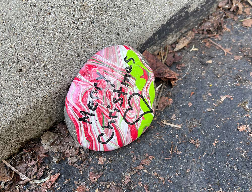 There’s an artist in my town who paints rocks with sweet messages and leaves them for people to find. Connor and I unearthed this hidden holiday treasure at the Christmas tree lot last week!