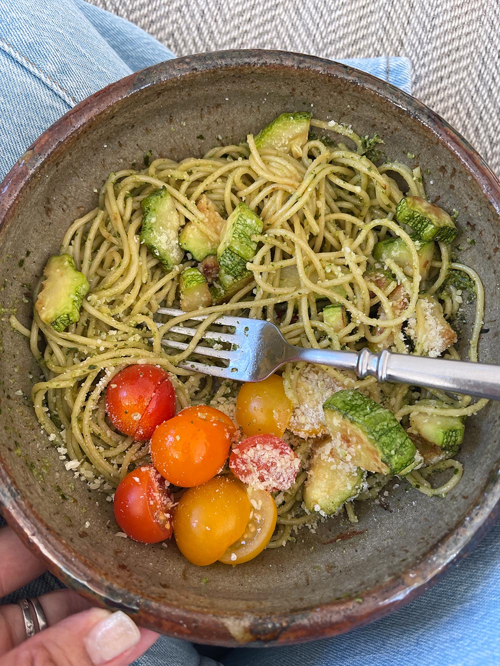Connor and I are obsessed! I used this recipe, which I got from my neighbor Ellen. I went to visit her and she fed me a bowl of freshly made pesto pasta made with basil from her farm, and I swear I had an out-of-body experience. I don’t know if I’ll ever be able to go back to the pre-made stuff in the jar, ahhh!