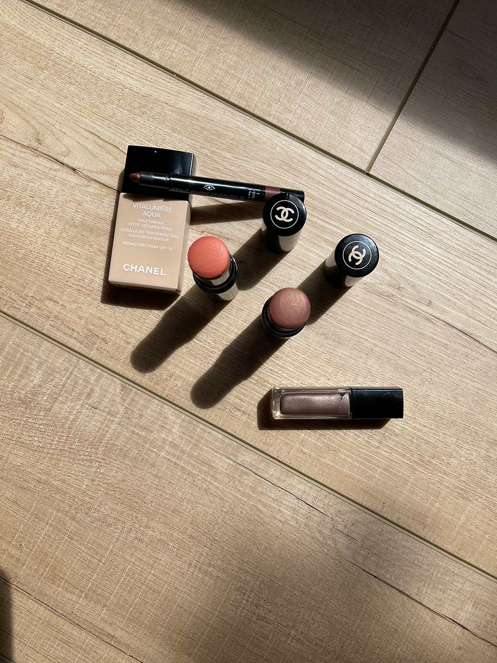 In these pics, I’m wearing the go-to Chanel makeup “uniform” I’ve been rocking all week: Vitalumiere Aqua Foundation (SO GOOD) on my skin; Les Beiges Cream Blushes in No. 22 and No. 20 layered together on my cheeks; and Electric Brown Eyeshadow-Liner-Khol topped with Liquid Eyeshadow in Desert Wind on my eyes. I’ll try to take more pictures soon to give you a better idea of the colors and textures, however I can safely say these pieces look great in-life and in phone selfies! Super easy to use, too.