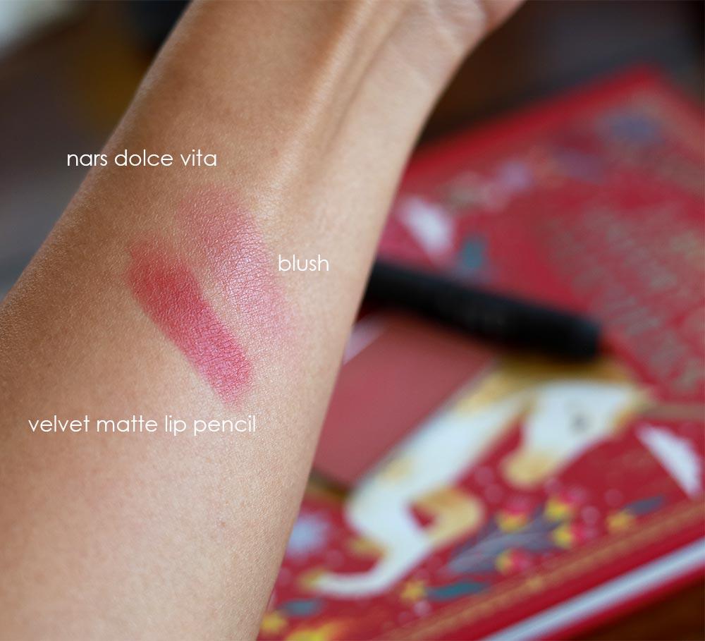 I do a swipe of Dolce Vita Velvet Matte Lip Pencil and a few swishes of the blush and dang, if it isn’t the easiest lip and cheek pairing EVER. I frickin’ love it! Makes me wish more brands did the same color for lipsticks and blushes, le sigh.