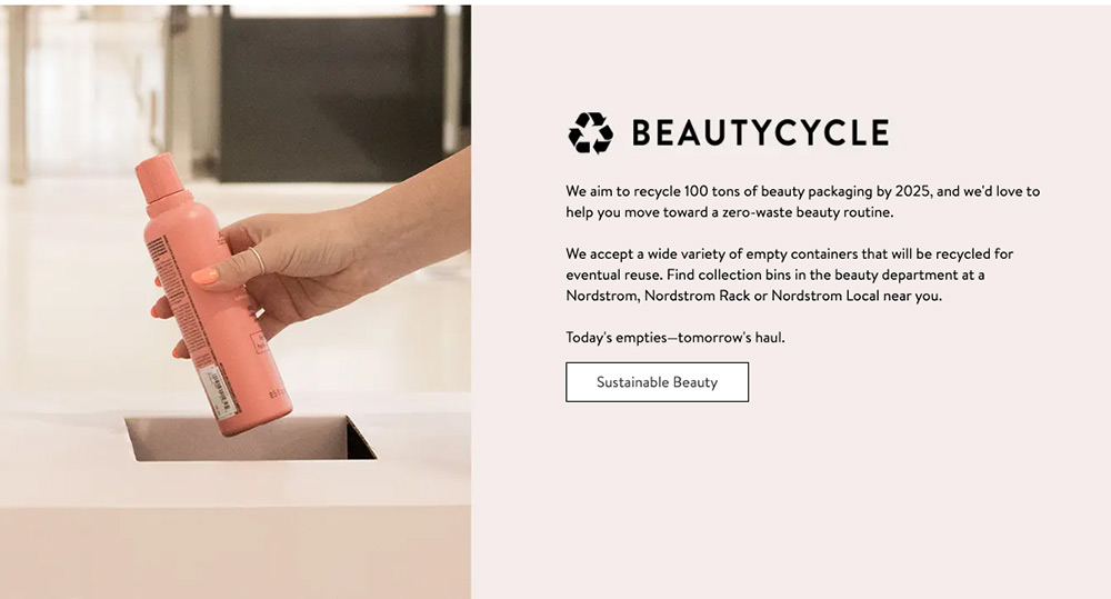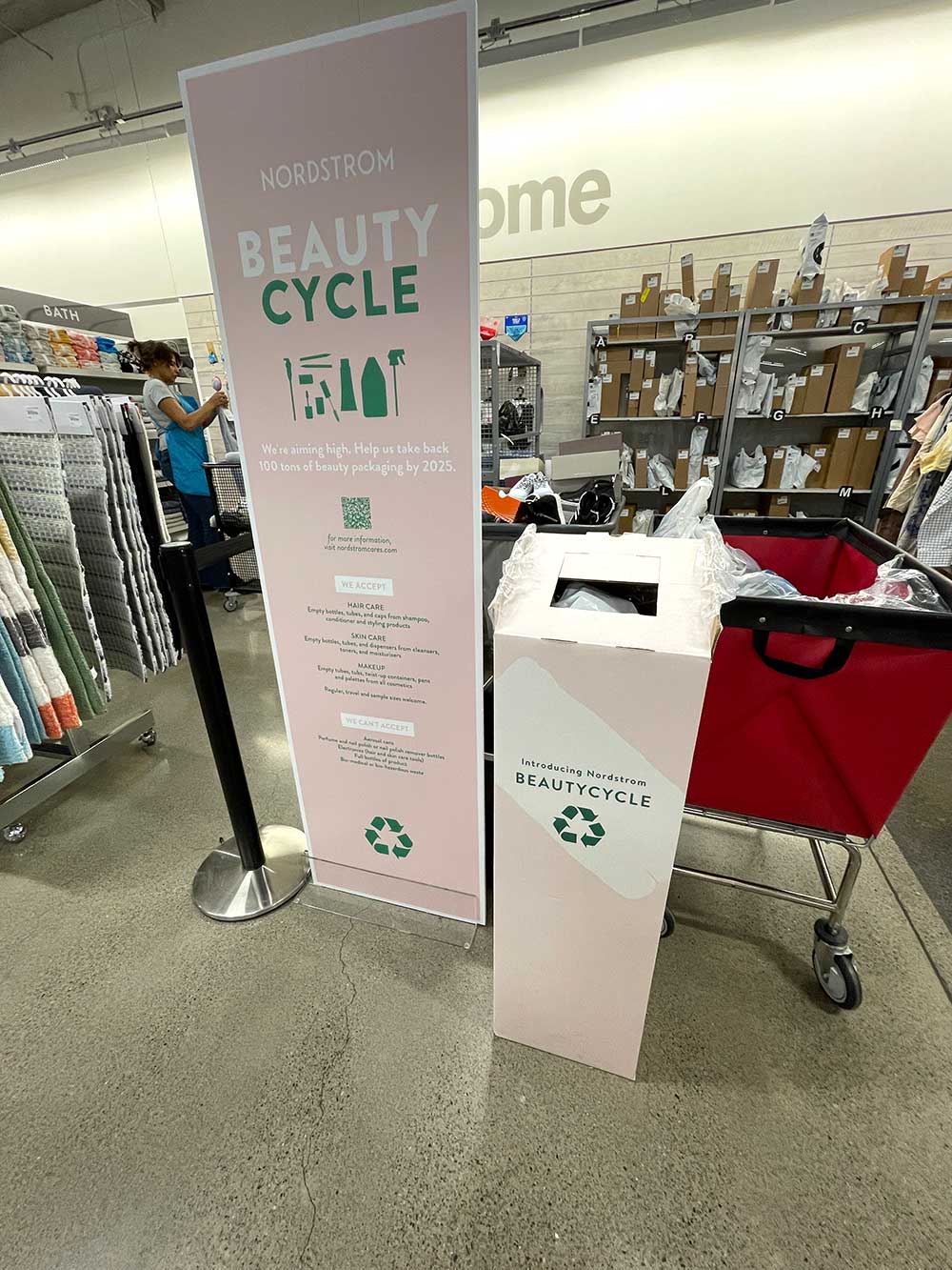 While I was at Nordstrom Rack yesterday to pick up my Anniversary Sale loot, I came across a display for recycling beauty products. Nordstrom now has a program called Nordstrom BEAUTYCYCLE, and they accept several different types of beauty packaging for recycling. Very cool!