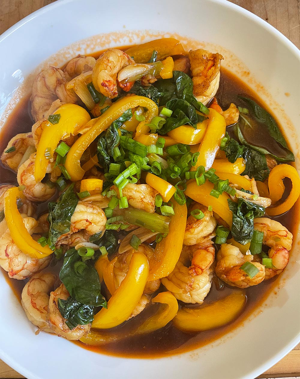 Let’s see, what else has been going on? I’ve been making a yummy, quick dish for dinner lately — Thai basil shrimp. I got the idea from this recipe I found on Laura in the Kitchen. The original recipe calls for chicken but I just swap it out for shrimp. I also substitute the chili for bell pepper because I don’t like a lot of heat.