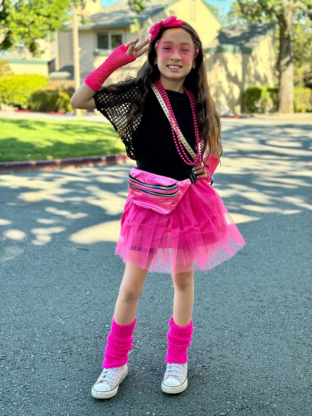 That rainbow dress is adorable and looks so comfy. But really it’s all about Connor’s ’80s look here-perfection. I had neon pink tube socks but I would usually wear one neon pink and one neon green. Then I wore a neon green tee under a neon pink tee so I could roll the sleeves and show a little bit of the green. I had some floral bike shorts to go with it and this was my favorite outfit circa 1989.
