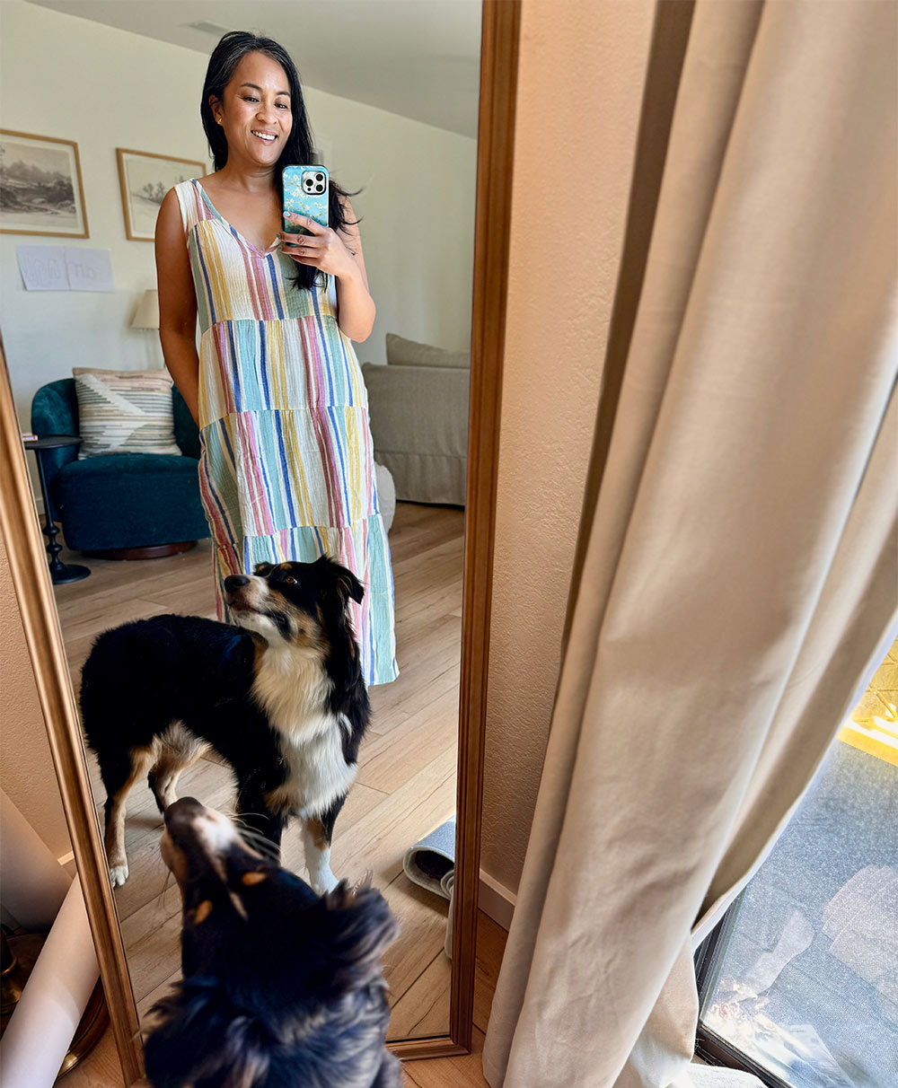I think that technically this striped number by Marine Layer is called a full-length dress rather than a muumuu, hmm. It’s a long dress with bright colors and a pattern, though, so I think it’s close enough. 🙂