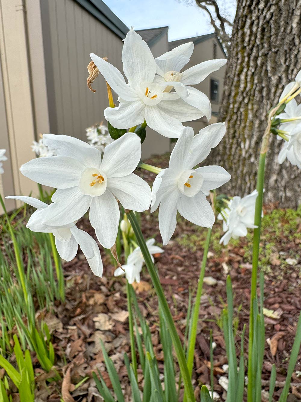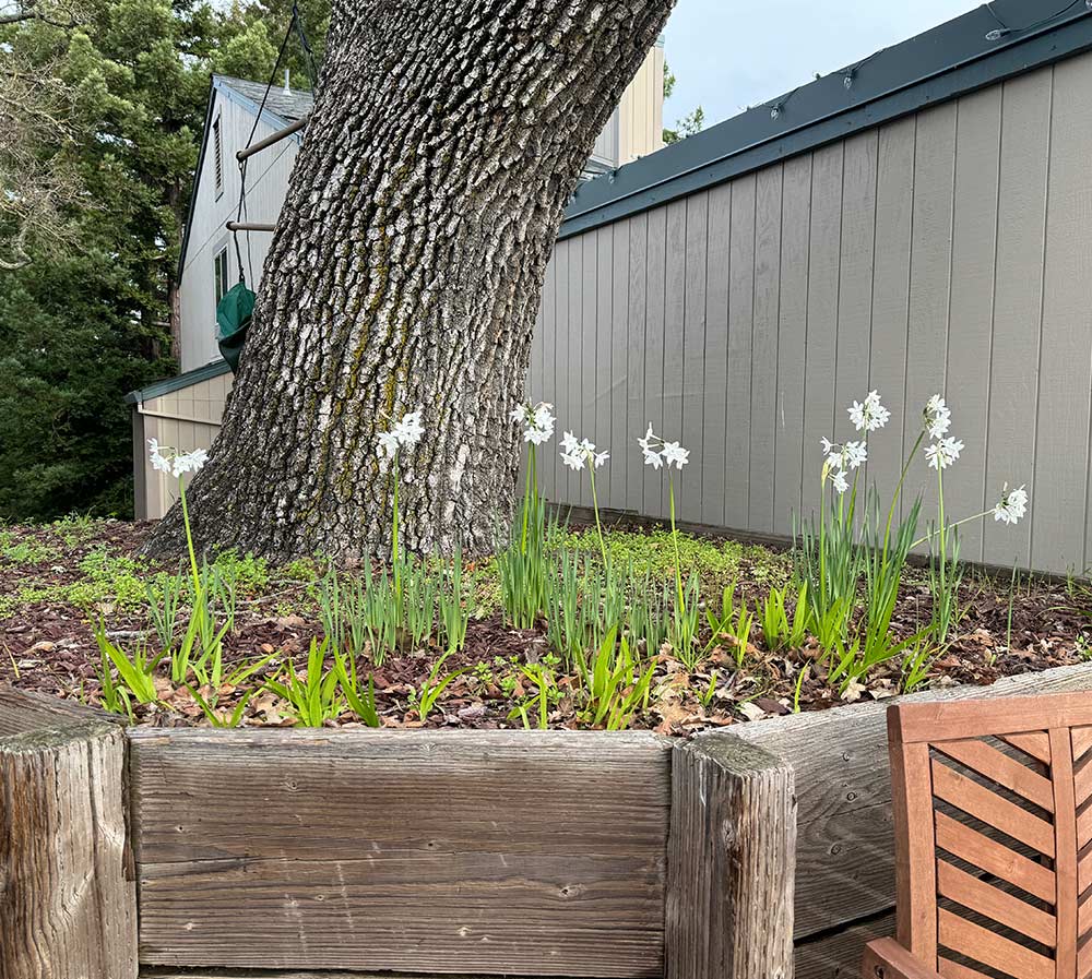 There are white flowers blooming in my neighbor’s yard (I think they’re called paperwhites)!