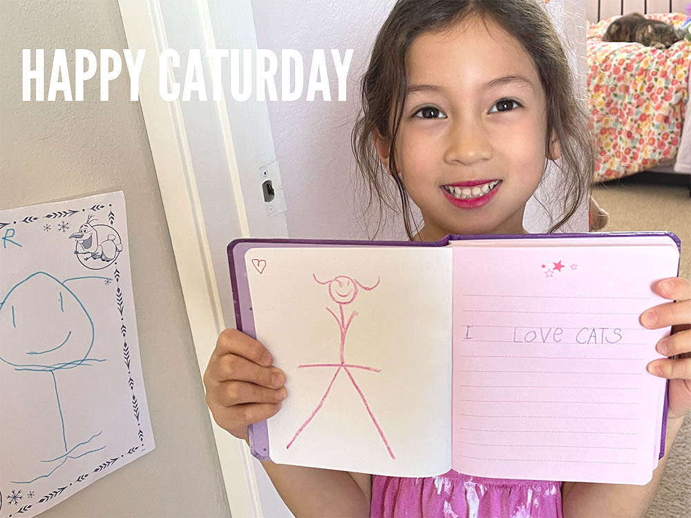 Good morning to you, friend! The ladies of Casa de MBB (myself included) are sending you good vibes this Caturday morning. Rosie-Pose, in particular, is feeling pleased as punch. Her number one girl, Connor Claire, wrote her very first sentence on her own this week, and the historical literary moment involved furry friends of the feline purr-suasian. 😺