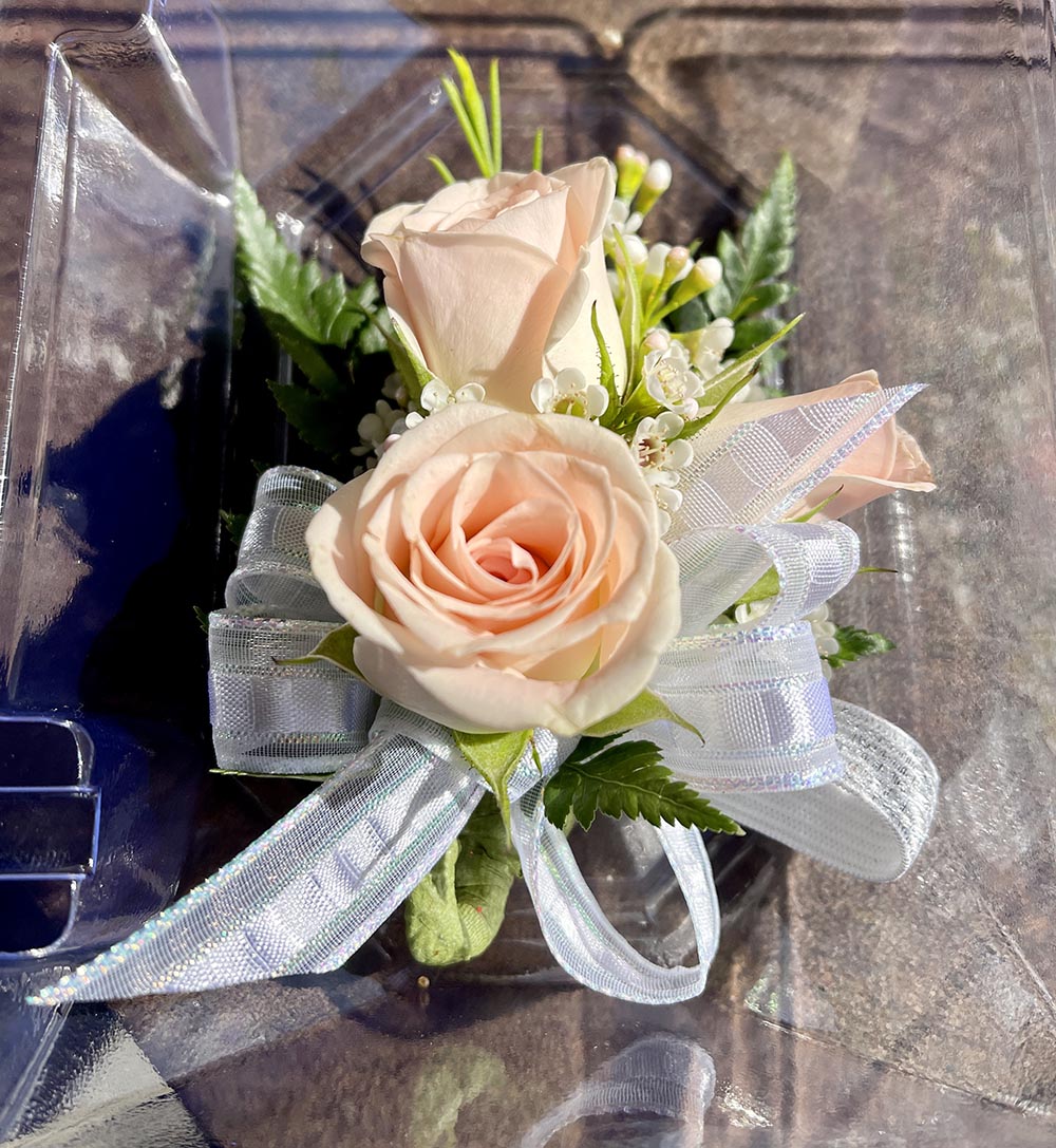 Guess what? Corsages are still a thing (just in case you were wondering). I haven’t thought about corsages since my high school prom. I just assumed they’d be out of fashion, but they’re not! — and you can still get them at floral shops. I found this out yesterday while looking for a corsage for Connor to wear to her school’s father-daughter dance. A local flower shop in town (Morning Glory Florist) made her a pretty custom corsage with pink roses.