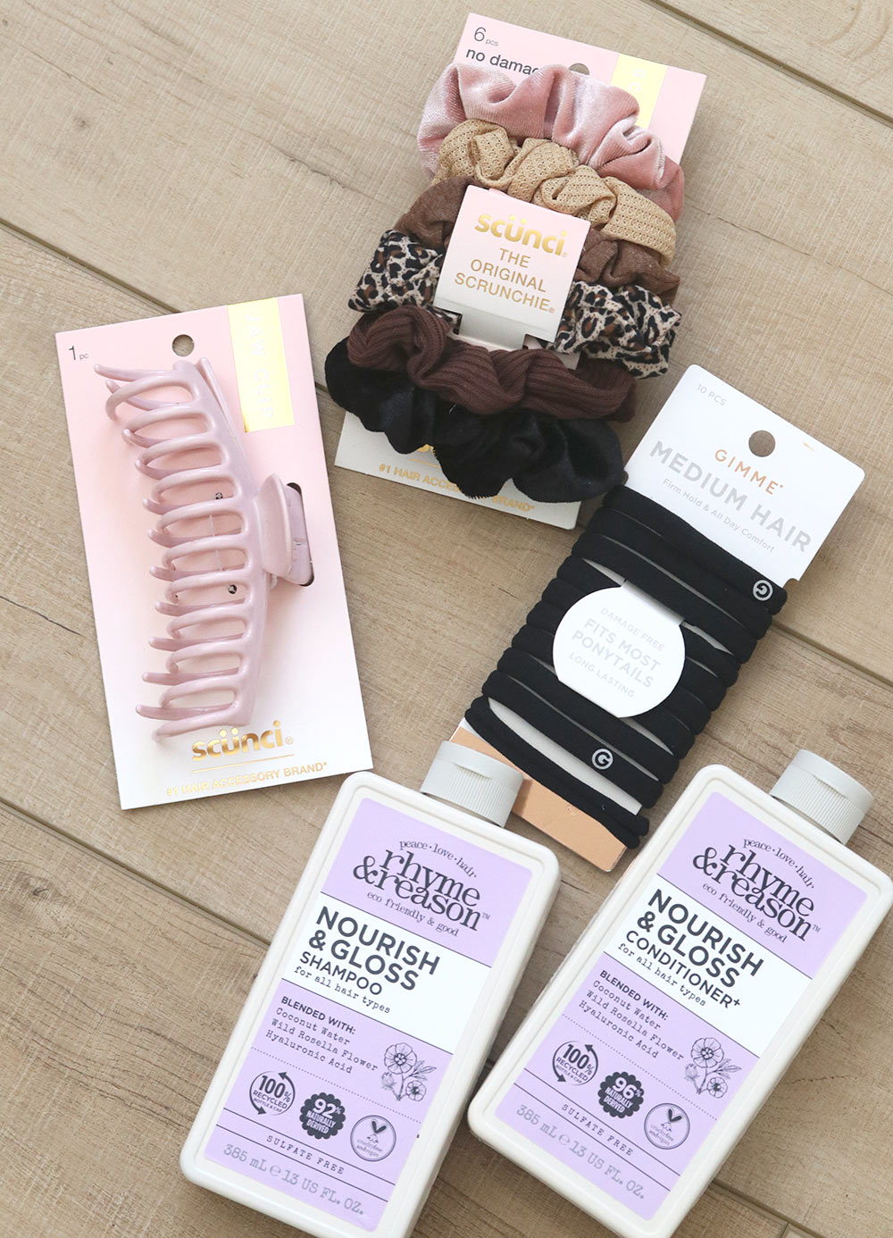 Right meow, I’m way too excited to put my hair up in one of these scrunchies. LOL! I went on a hair accessory hunt yesterday and grabbed a few things from Target: Scrunchies in neutral tones, a pink oversized jaw clip, black hair ties that allegedly don’t damage your hair, and a shampoo and conditioner set by a brand new to me called Rhyme & Reason.