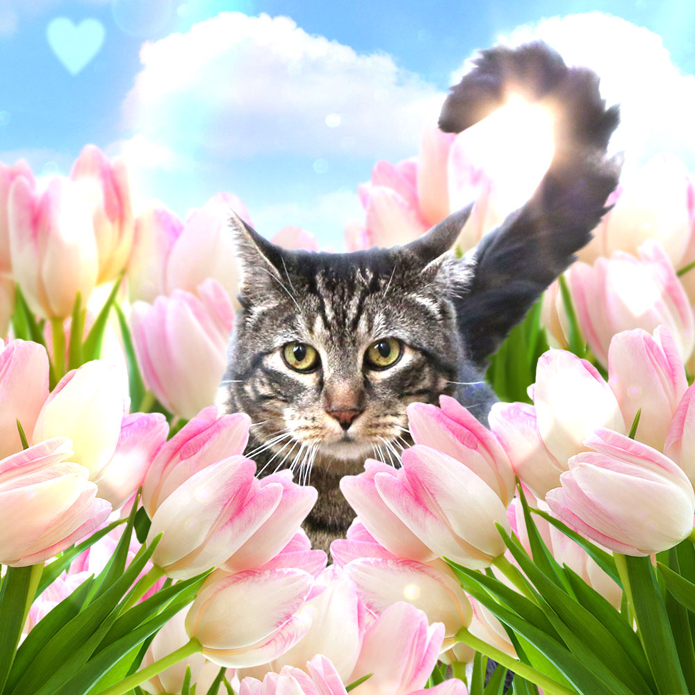 This is the time of year one of my tabby’s favorite flowers bloomed. Tulips! He loved almost everything about them. (“Almost” because he did not like the fact that they’re toxic.)