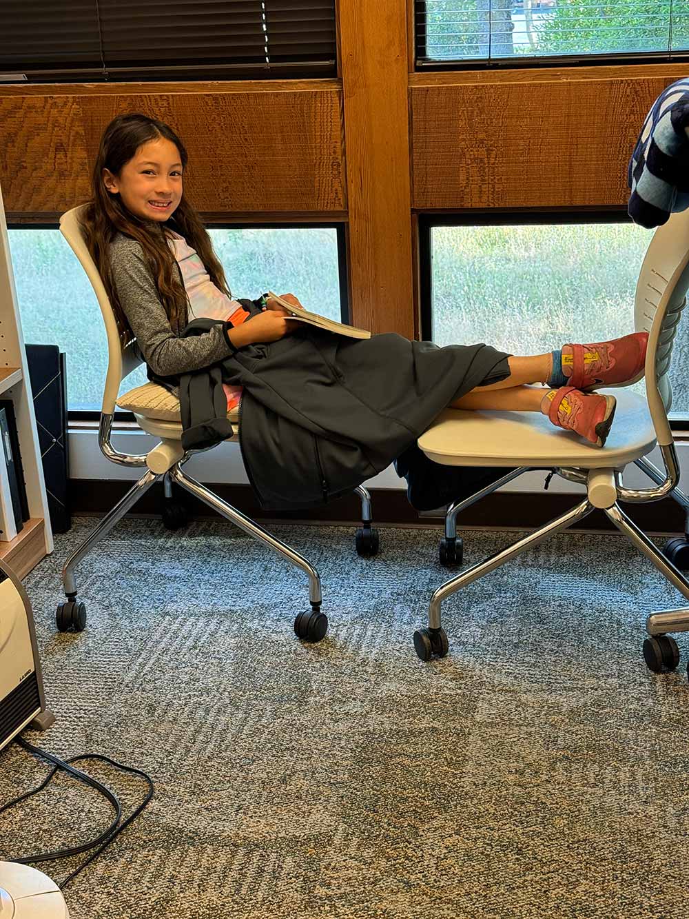 Now that I’m working in an office, I’ve got to juggle taking her to camp and picking her up in between manning my desk, which means adjusting my schedule in all kinds of funky ways. This week, I had Connor come in with me to work at the crack of dawn. We improvised a reading corner for her to chill out in while I furiously banged through emails so that I could meet my deadlines.