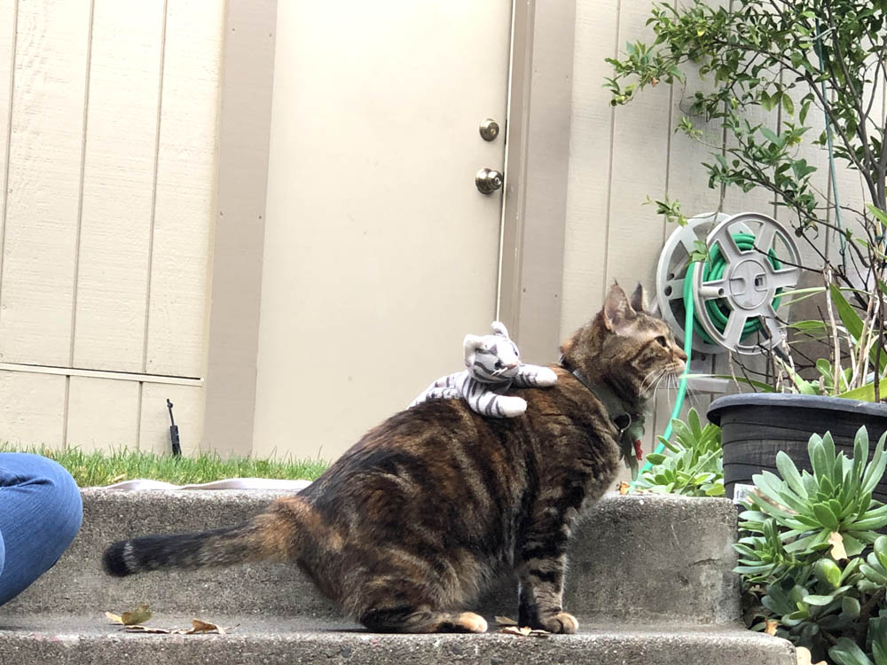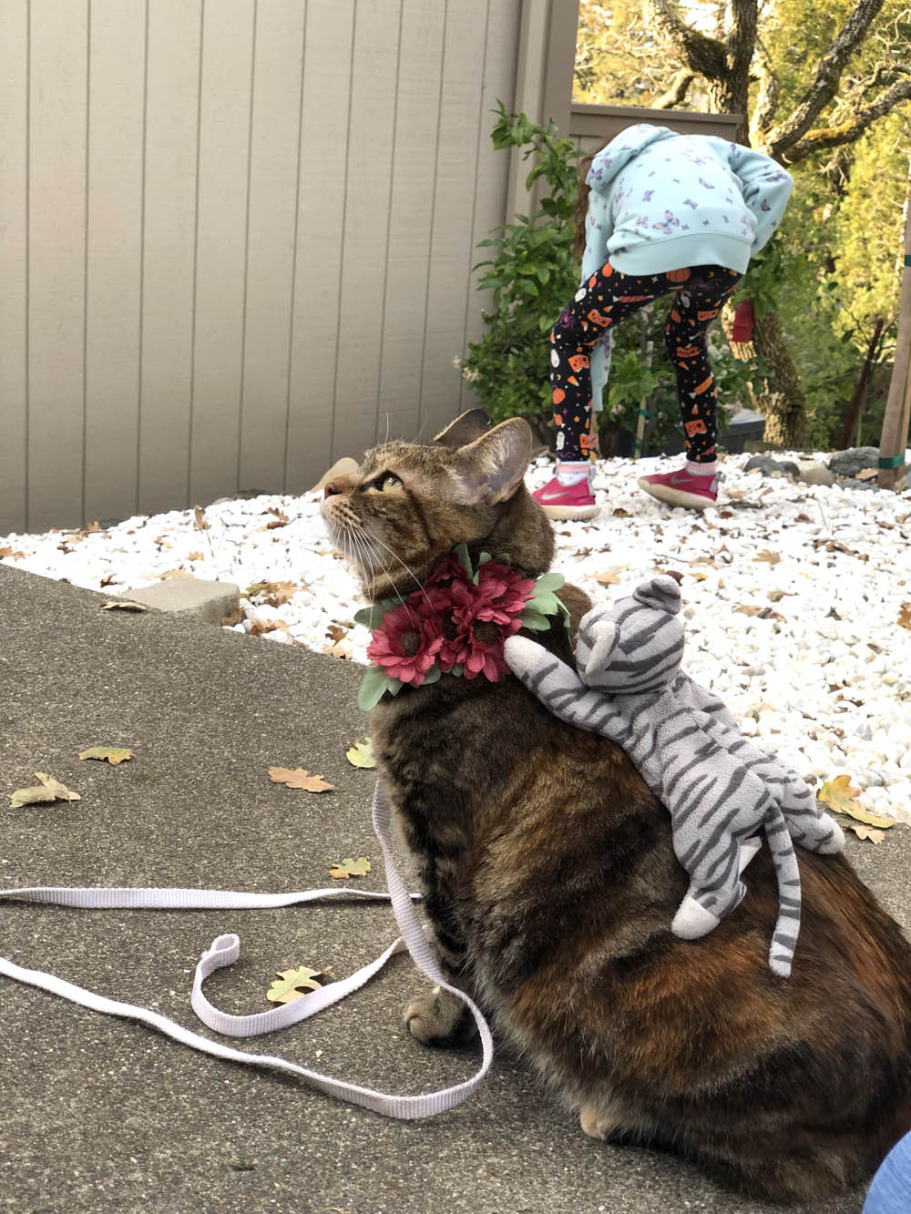 Rosie-Pose has a penchant for withdrawing into solitude whenever she’s deep in scientific thought, and although she isn’t as socially active as Tabs was, she still gets along famously well with all the cats she runs into (except Harris). She also occasionally lets her maternal side surface when she sees cute tiny stuffed cats, like, she’s taken Stripey here under her wing. He’s one of Connor’s stuffies, and Rosie has big plans for him to be the next scientific cat mastermind. She’s identified that he has an aptitude for robotics and has taken him in as one of her interns. 🙂