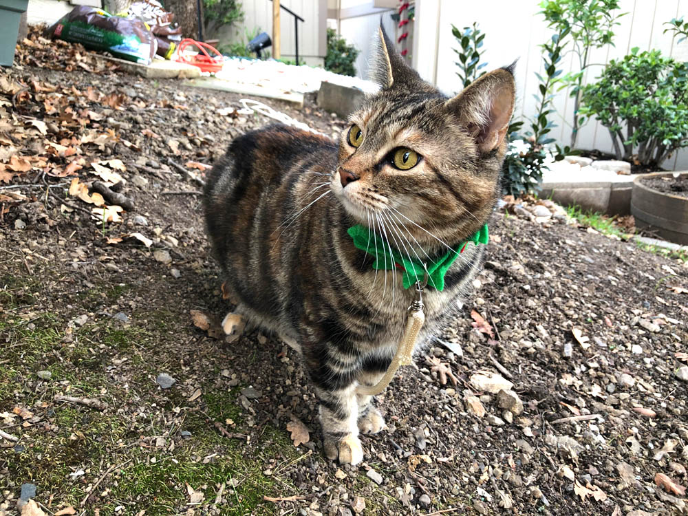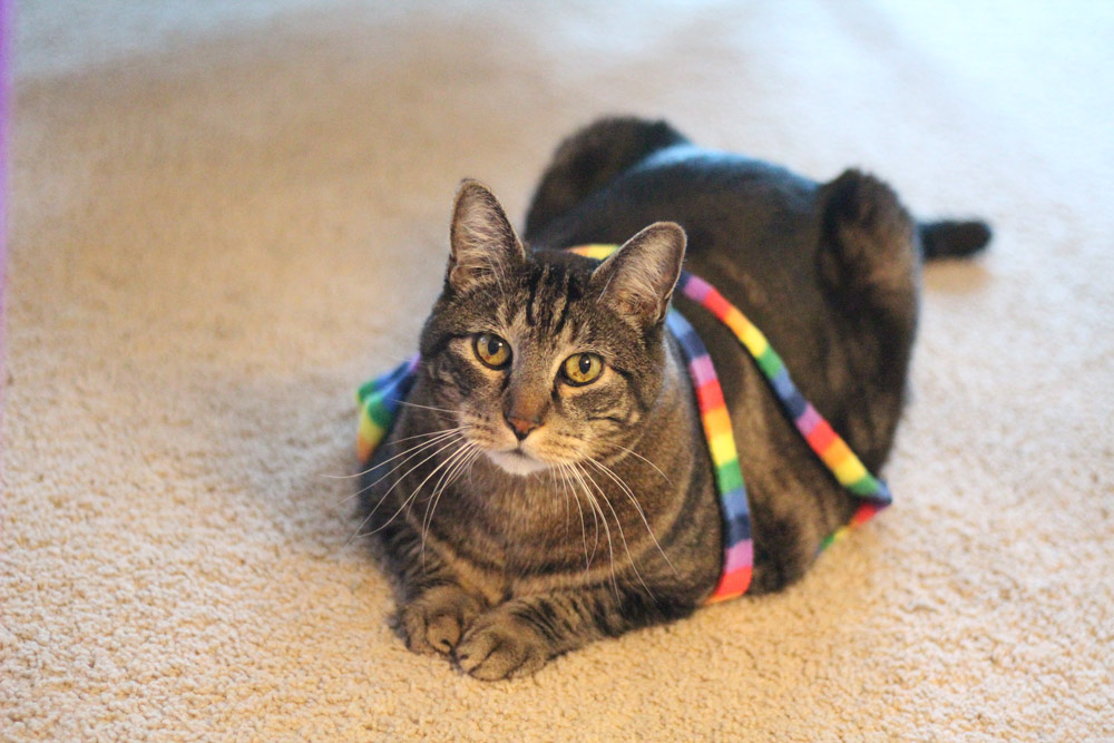I’m not kidding! I mean, putting on the outfits, coaxing him to look at the camera, sometimes bribing him with treats, enlisting El Hub to stand behind the camera waving a feather cat teaser toy to get his attention — frankly, the tricks of the pet blogging trade. Yup, sometimes to get a good pic of Tabs looking dreamily into the camera took A LOT of work. Sometimes dozens and dozens of pictures to get one great one.